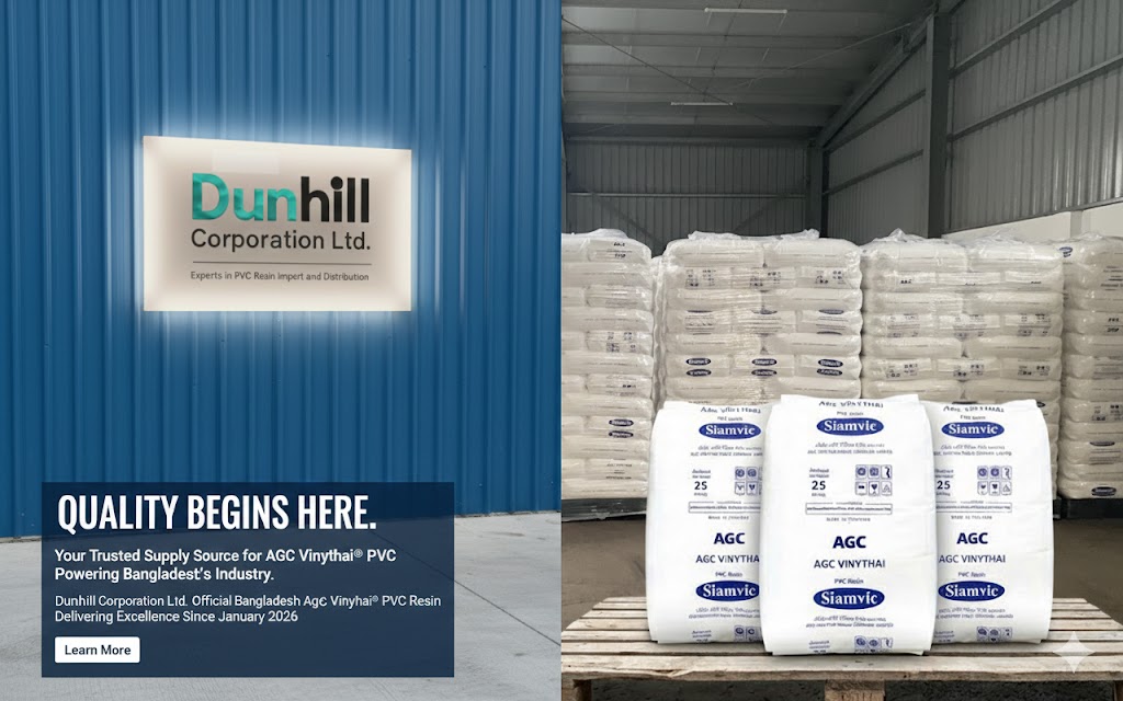 Dunhill Corporation Ltd., founded in 1994, supplies premium PVC resin to industries across Bangladesh. As the exclusive agent of AGC Vinythai (Thailand), we provide reliable, high-quality raw materials trusted by manufacturers of pipes, cables, footwear, sheets, profiles, toys, and artificial leather—making us a leading name in the polymer market.